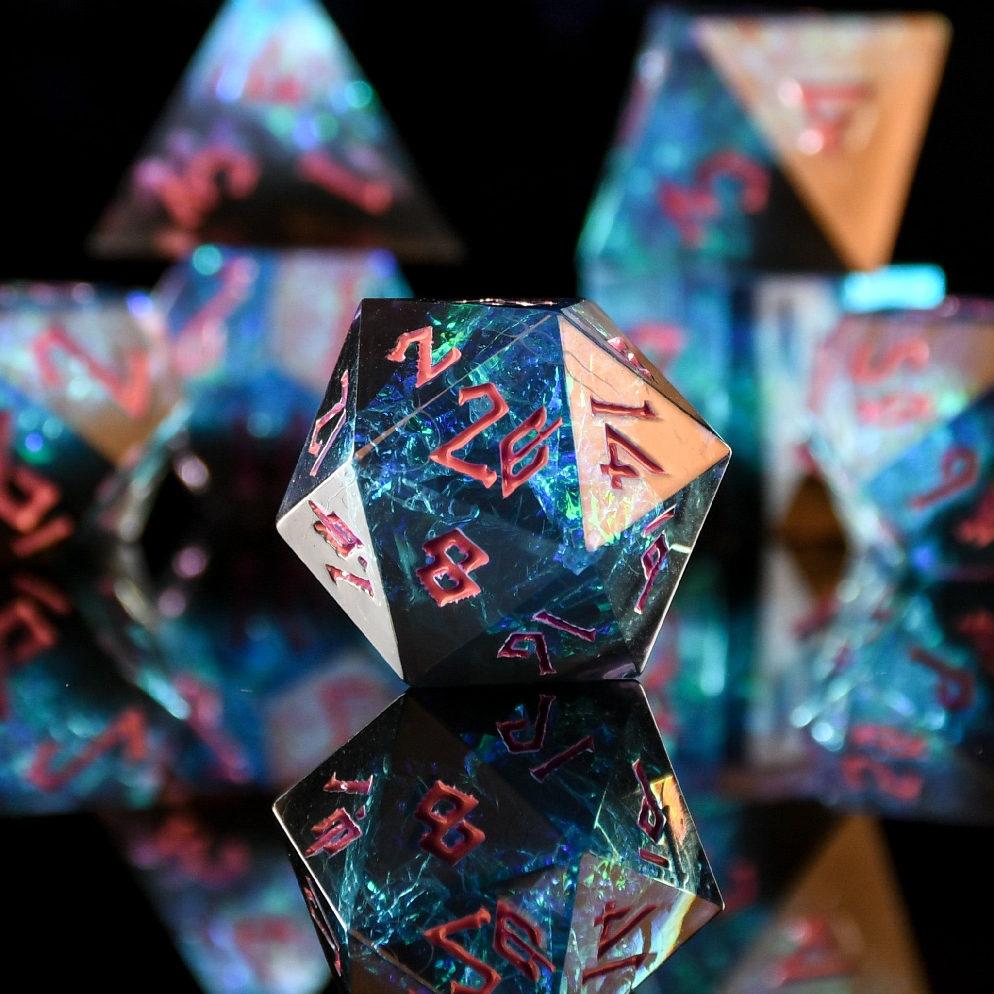 Hand-crafted from beginning to end, our sharp-edged resin dice feature gorgeously hand-painted numbers. These dice are ideal for any tabletop RPG game and are sure to impress at your upcoming session!