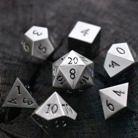 Our metal dice sets are all cast from zinc alloy metal to assure better balanced rolls. This set is perfect for any RPG and will be sure to impress at your upcoming session! Every set comes with its own metal dice tin for easy storage and a winning presentation.