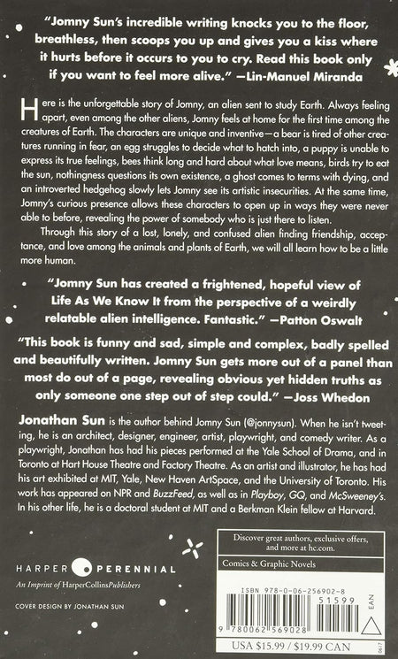 “Jomny Sun has created a frightened, hopeful view of Life As We Know It from the perspective of a weirdly relatable alien intelligence. Fantastic.” — Patton Oswalt